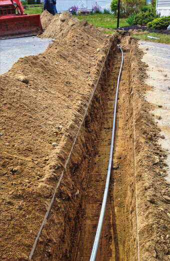 Compliant trenching services and installation of electrical-grade conduit for underground mains cabling, including proper backfill, warning tape, and compaction.